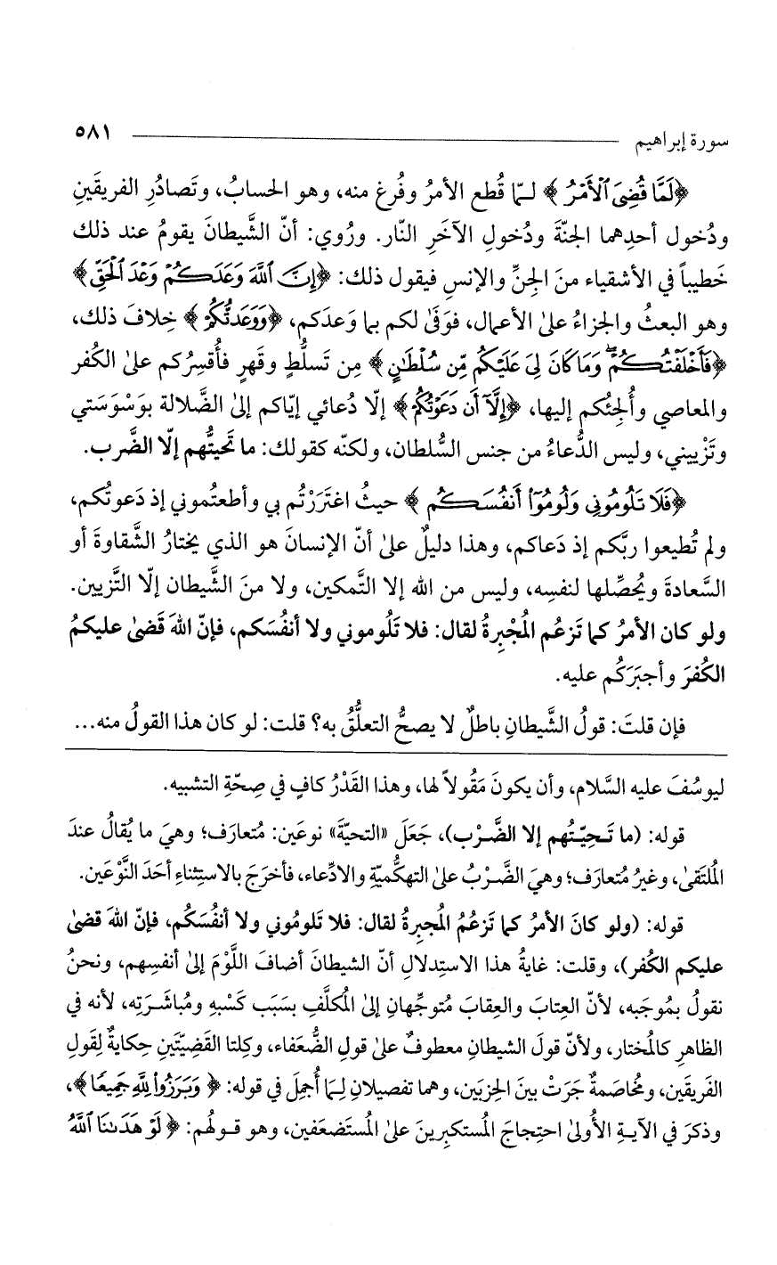 قوله: (ولو كان الأمر كما تزعم المجبرة لقال: فلا تلوموني ولا أنفسكم، فإن الله قضى عليكم الكفر)، وقلت: غاية هذا الاستدلال أن الشيطان أضاف اللوم إلى أنفسهم، ونحن نقول بموجبه، لأن العتاب والعقاب متوجهان إلى المكلف بسبب كسبه ومباشرته، لأنه في الظاهر كالمختار، ولأن قول الشيطان معطوف على قول الضعفاء، وكلتا القضيتين حكاية لقول الفريقين، ومخاصمة جرت بين الحزبين، وهما تفصيلان لما أجمل في قوله: (وَبَرَزُوا لِلَّهِ جَمِيعاً)، وذكر في الآية الأولى احتجاج المستكبرين على المستضعفين، وهو قولهم: (لَوْ هَدَانَا اللَّهُ