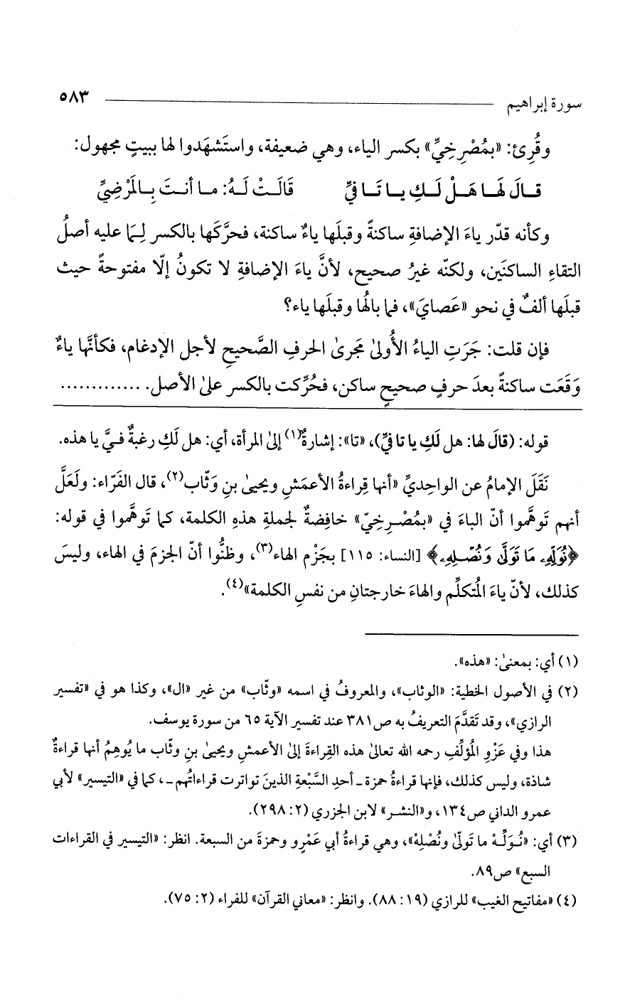 نقل الإمام عن الواحدي "أنها قراءة الأعمش ويحيى بن وثاب، قال الفراء: ولعل أنهم توهموا أن الباء في "بمصرخي" خافضة لجملة هذه الكلمة، كما توهموا في قوله: (نُوَلِّهِ مَا تَوَلَّى وَنُصْلِهِ) [النساء: 115] بجزم الهاء، وظنوا أن الجزم في الهاء، وليس كذلك، لأن ياء المتكلم والهاء خارجتان من نفس الكلمة".