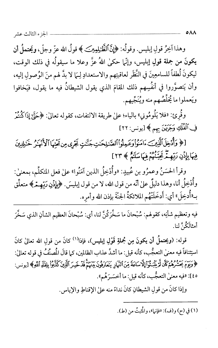 قوله: (ويحتمل أن يكون من جملة قول إبليس)، فإذا كان من قول الله تعالى كان استئنافاً فيه معنى التعجب، كأنه قيل: ما أشد عذاب الظالمين، كما قال المصنف في قوله تعالى: (وَيَوْمَ يَحْشُرُهُمْ كَأَنْ لَمْ يَلْبَثُوا إِلاَّ سَاعَةً مِنْ النَّهَارِ يَتَعَارَفُونَ بَيْنَهُمْ قَدْ خَسِرَ الَّذِينَ كَذَّبُوا بِلِقَاءِ اللَّهِ) [يونس: 45]: "فيه معنى التعجب، كأنه قيل: ما أخسرهم".
