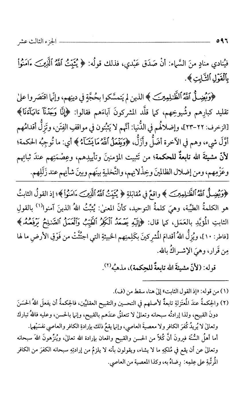 قوله: (لأن مشيئة الله تابعة للحكمة)، مذهبه.