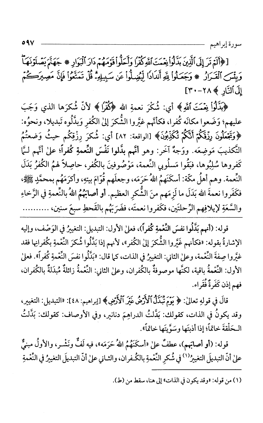 قوله: (أنهم بدلوا نفس النعمة كفراً)، فعلى الأول: التبديل: التغيير في الوصف، وإليه الإشارة بقوله: "فكأنهم غيروا الشكر إلى الكفر"، لأنهم إذا بدلوا شكر النعمة بكفرانها فقد غيروا صفة النعمة، وعلى الثاني: التغيير في الذات، كما قال: "بدلوا نفس النعمة كفراً". فعلى الأول: النعمة باقية، لكنها موصوفة بالكفران، وعلى الثاني: النعمة زائلة مبدلة بالكفران، فهم إذن كفرة فقراء.