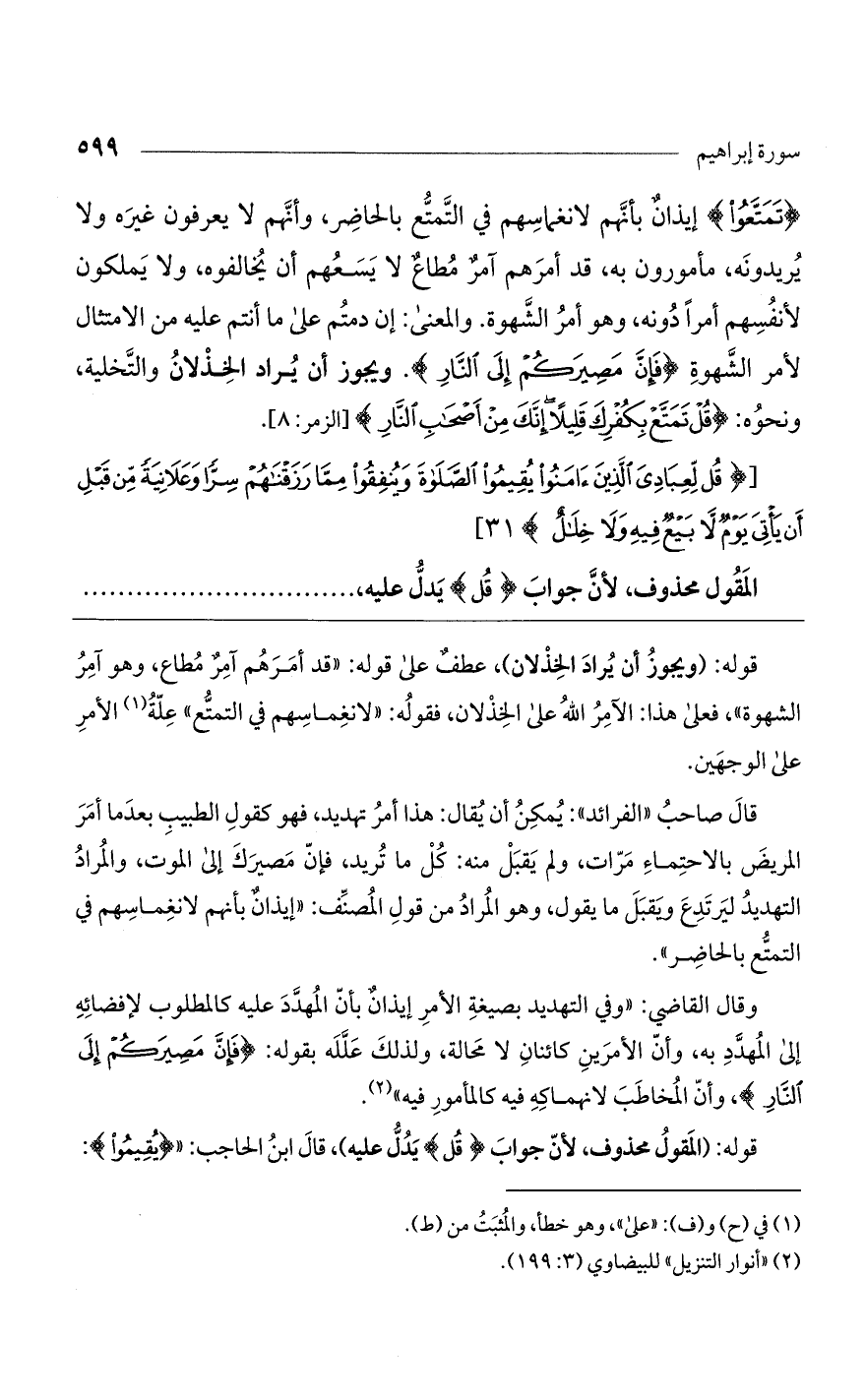 وقال القاضي: "وفي التهديد بصيغة الأمر إيذان بأن المهدد عليه كالمطلوب لإفضائه إلى المهدد به، وأن الأمرين كائنان لا محالة، ولذلك علله بقوله: (فَإِنَّ مَصِيرَكُمْ إِلَى النَّارِ)، وأن المخاطب لانهماكه فيه كالمأمور فيه".