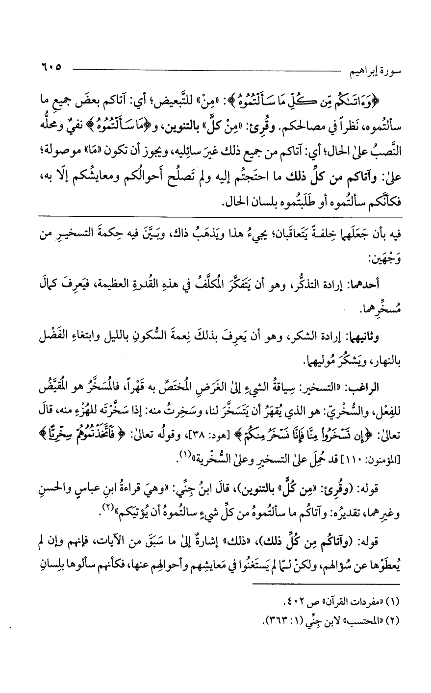 قوله: (وقرئ: "من كل" بالتنوين"، قال ابن جني: "وهي قراءة ابن عباس والحسن وغيرهما، تقديره: وآتاكم ما سألتموه من كل شيء سألتموه أن يؤتيكم".