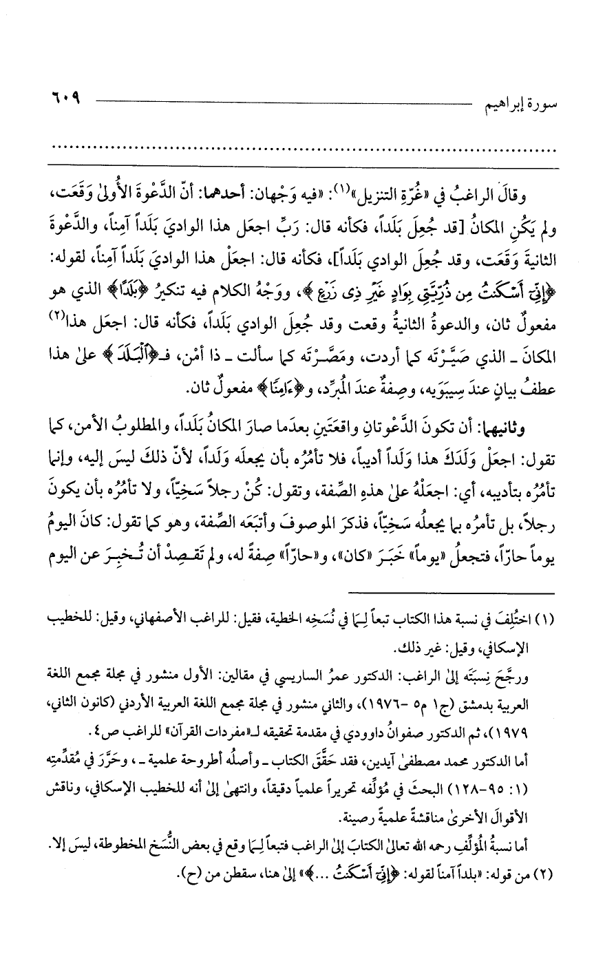 وقال الراغب في "غرة التنزيل": "فيه وجهان: أحدهما: أن الدعوة الأولى وقعت، ولم يكن المكان [قد جعل بلداً، فكأنه قال: رب اجعل هذا الوادي بلداً آمناً، والدعوة الثانية وقعت، وقد جعل الوادي بلداً]، فكأنه قال: اجعل هذا الوادي بلداً آمناً، لقوله: (إِنِّي أَسْكَنتُ مِنْ ذُرِّيَّتِي بِوَادٍ غَيْرِ ذِي زَرْعٍ)، ووجه الكلام فيه تنكير (بَلَداً) الذي هو مفعول ثان، والدعوة الثانية وقعت وقد جعل الوادي بلداً، فكأنه قال: اجعل هذا المكان- الذي صيرته كما أردت، ومصرته كما سألت- ذا أمن، فـ (الْبَلَدَ) على هذا عطف بيان عند سيبويه، وصفة عند المبرد، و (آَمِناً) مفعول ثان.