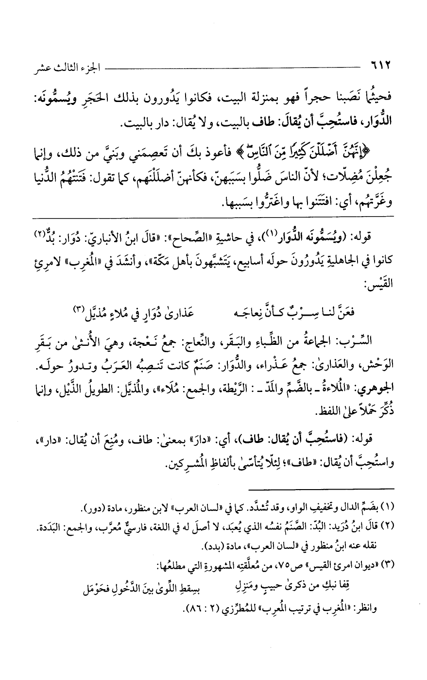 قوله: (فاستحب أن يقال: طاف)، أي: "دار" بمعنى: طاف، ومنع أن يقال: "دار"، واستحب أن يقال: "طاف"؛ لئلا يتأسى بألفاظ المشركين.