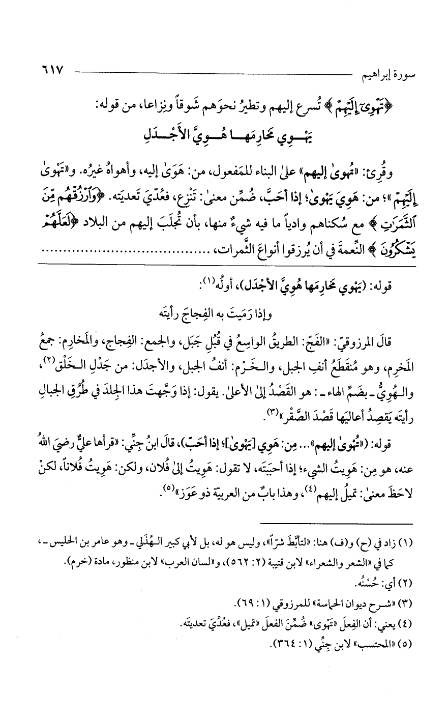 قوله: ("تهوى إليهم" ... من هوي [يهوى]؛ إذا أحب)، قال ابن جني: "قرأها علي رضي الله عنه، هو من: هويت الشيء؛ إذا أحببته، لا تقول: هويت إلى فلان، ولكن: هويت فلاناً، لكن لاحظ معنى: تميل إليهم، وهذا باب من العربية ذو عوز".