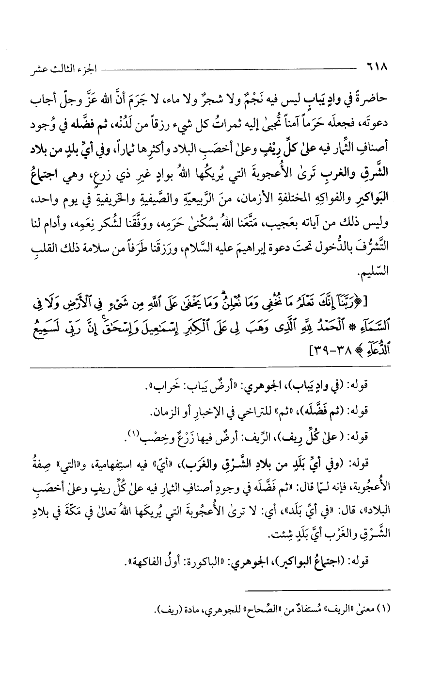 حاضرةً في وادٍ يبابٍ ليس فيه نجم ولا شجر ولا ماء لا جرم أن الله عز وجلّ أجاب دعوته فجعله حرماً آمنا تجبى إليه ثمرات كل شيء رزقاً من لدنه، ثم فضله في وجود أصناف الثمار فيه على كل ريفٍ وعلى أخصب البلاد وأكثرها ثماراً، وفي أي: بلد من بلاد الشرق والغرب ترى الأعجوبة التي يريكها الله بواد غير ذي زرع، وهي اجتماع البواكير والفواكه المختلفة الأزمان من الربيعية والصيفية والخريفية في يوم واحد، وليس ذلك من آياته بعجيب، متعنا الله بسكنى حرمه، ووفقنا لشكر نعمه، وأدام لنا التشرف بالدخول تحت دعوة إبراهيم عليه السلام، ورزقنا طرفا من سلامة ذلك القلب السليم.