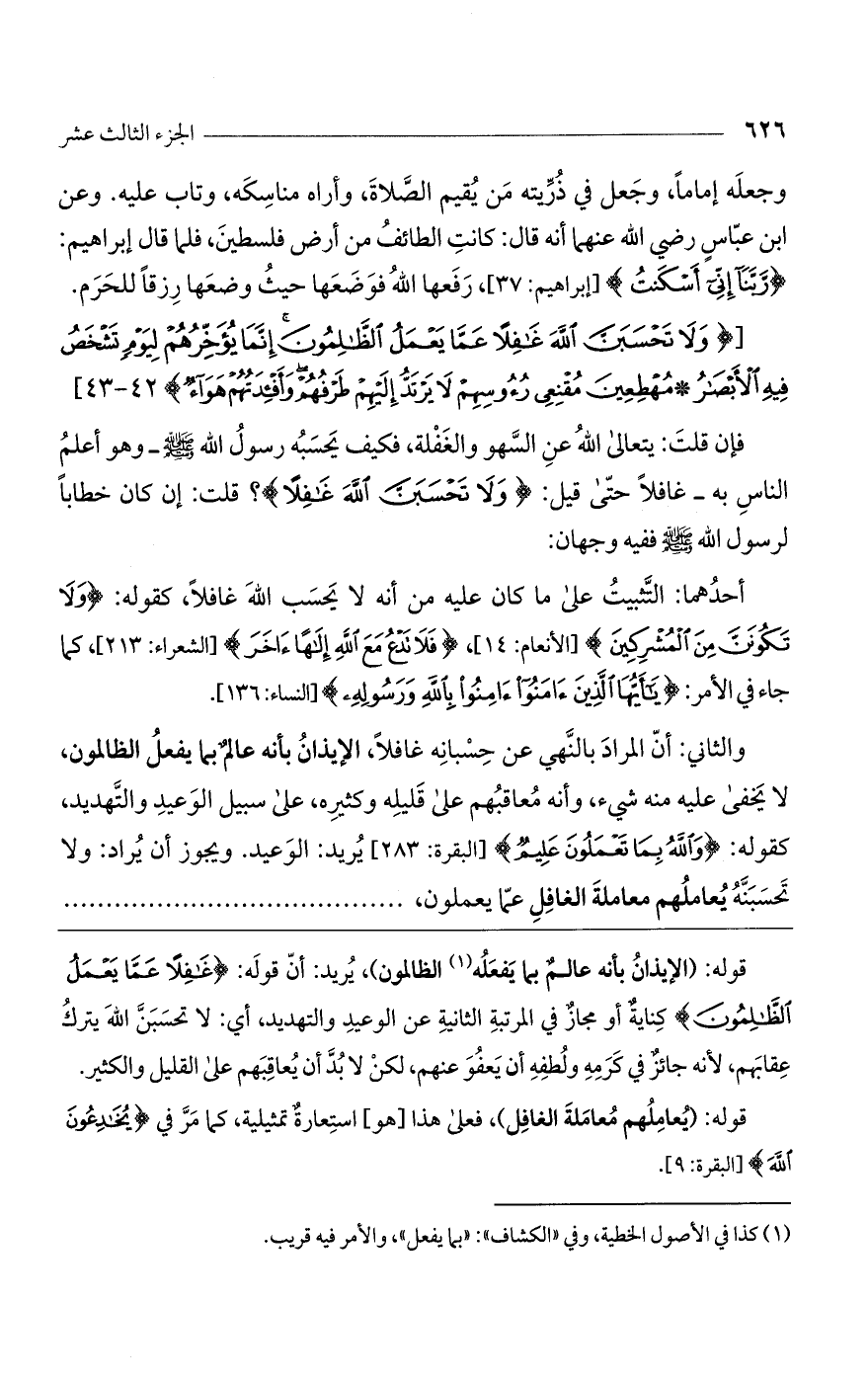 والثاني: أنّ المراد بالنهي عن حسبانه غافلاً، الإيذان بأنه عالم بما يفعل الظالمون، لا يخفى عليه منه شيء، وأنه معاقبهم على قليله وكثيره على سبيل الوعيد والتهديد كقوله: وَاللَّهُ بِما تَعْمَلُونَ عَلِيمٌ يريد الوعيد. ويجوز أن يراد: ولا تحسبنه يعاملهم معاملة الغافل عما يعملون،
