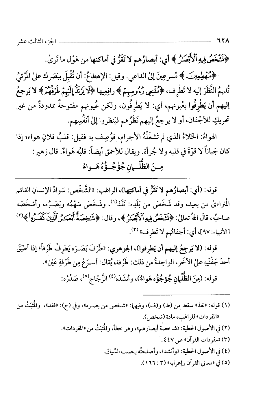 قوله: (أي: أبصارهم لا تقر في أماكنها)، الراغب: "الشخص: سواد الإنسان القائم المتراءى من بعيد، وقد شخص من بلده: نفذ، وشخص سهمه وبصره، وأشخصه صاحبه، قال الله تعالى: (تَشْخَصُ فِيهِ الأَبْصَارُ)، وقال: (شَاخِصَةٌ أَبْصَارُ الَّذِينَ كَفَرُوا) [الأنبياء: 97]، أي: أجفانهم لا تطرف".