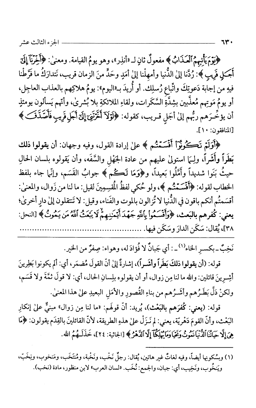 قوله: (أن يقولوا ذلك بطراً وأشراً)، إشارة إلى أن القول مضمر، أي: ألم يكونوا بطرين أشرين قائلين: والله ما لنا من زوال، أو أن يقولوه بلسان الحال، أي: لا قول ثمة ولا قسم، ولكن دل بطرهم وأشرهم من بناء القصور والأمل البعيد على هذا المعنى.