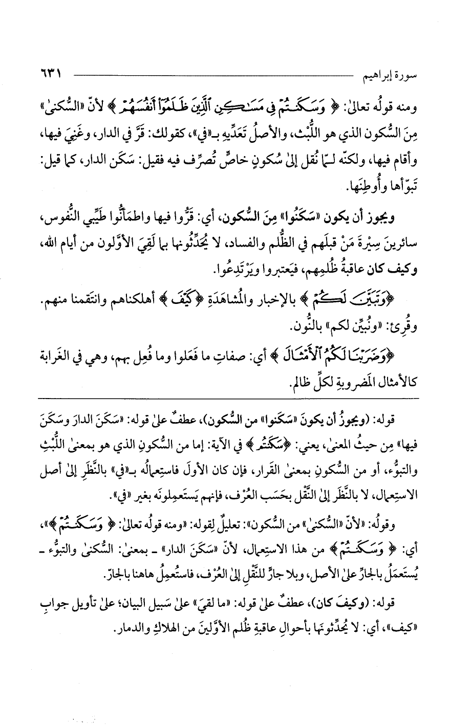 ومنه قوله تعالى (وَسَكَنْتُمْ فِي مَساكِنِ الَّذِينَ ظَلَمُوا أَنْفُسَهُمْ) لأنّ "السكنى" من السكون الذي هو اللبث، والأصل تعدّيه بـ"في"، كقولك: قرّ في الدار وغني فيها وأقام فيها، ولكنه لما نقل إلى سكون خاص تصرف فيه فقيل: سكن الدار كما قيل: تبوّأها وأوطنها.