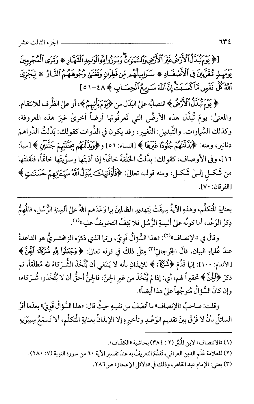 (يَوْمَ تُبَدَّلُ الْأَرْضُ) انتصابه على البدل من (يوم يأتيهم)، أو على الظرف للانتقام. والمعنى: يوم تبدّل هذه الأرض التي تعرفونها أرضاً أخرى غير هذه المعروفة، وكذلك السموات. والتبديل: التغيير، وقد يكون في الذوات كقولك: بدّلت الدراهم دنانير. ومنه (بَدَّلْناهُمْ جُلُوداً غَيْرَها) [النساء: 56] و (وبَدَّلْناهُمْ بِجَنَّتَيْهِمْ جَنَّتَيْنِ) [سبأ: 16]، وفي الأوصاف، كقولك: بذلت الحلقة خاتماً، إذا أذبتها وسويتها خاتماً، فنقلتها من شكل إلى شكل. ومنه قوله تعالى (فَأُوْلئِكَ يُبَدِّلُ اللَّهُ سَيِّئاتِهِمْ حَسَناتٍ) [الفرقان: 70].