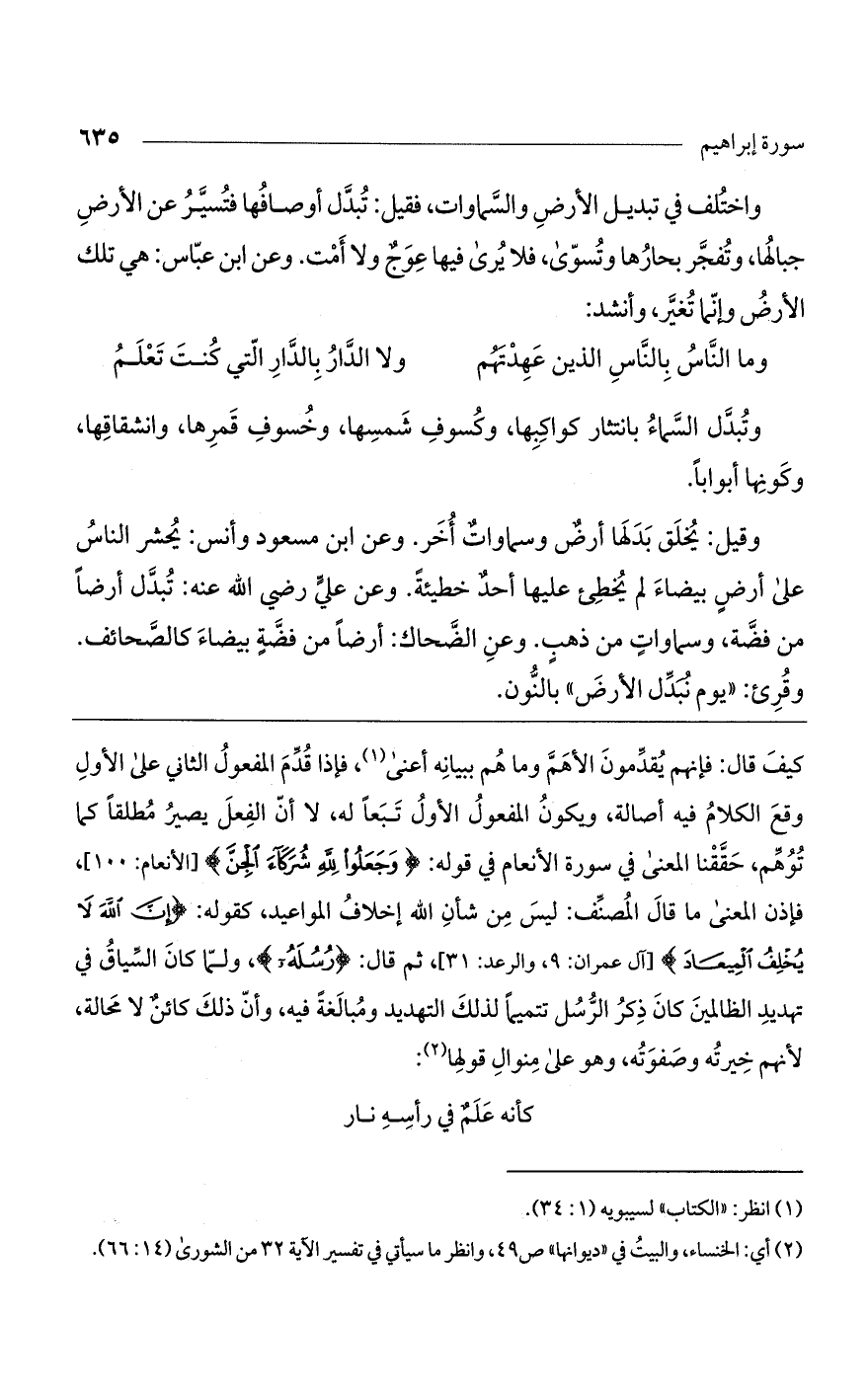 واختلف في تبديل الأرض والسموات، فقيل: تبدّل أوصافها فتسير عن الأرض جبالها وتفجر بحارها وتسوّى فلا يرى فيها عوج ولا أمت. وعن ابن عباس: هي تلك الأرض وإنما تغير، وأنشد: