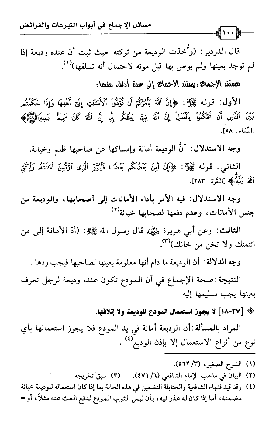 • وجه الاستدلال: فيه الأمر بأداء الأمانات إلى أصحابها، والوديعة من جنس الأمانات، وعدم دفعها لصحابها خيانة (¬2).