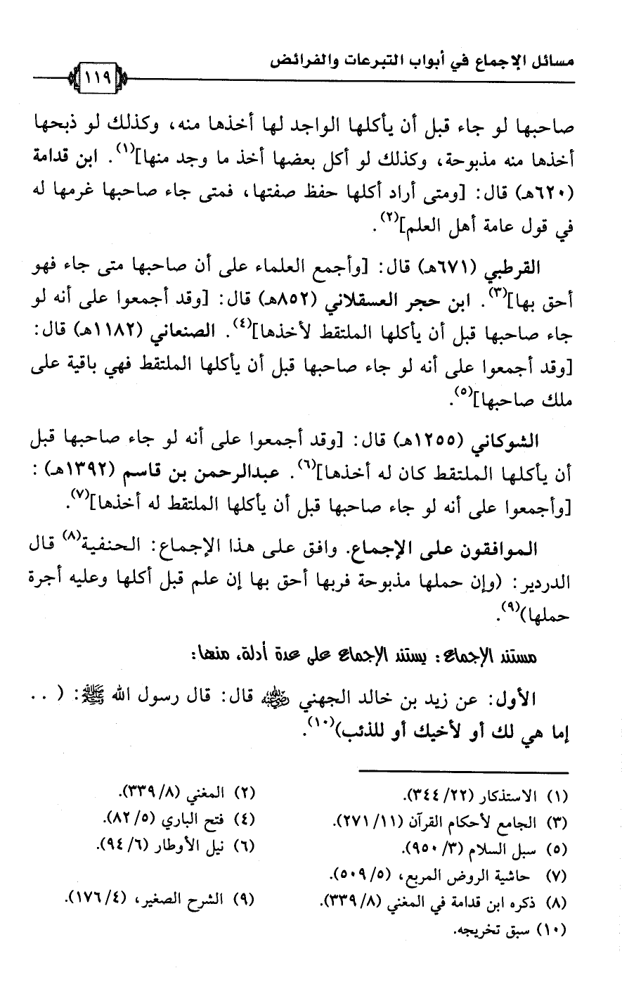 الشوكاني (1255 هـ) قال: [وقد أجمعوا على أنه لو جاء صاحبها قبل أن يأكلها الملتقط كان له أخذها] (¬6). عبد الرحمن بن قاسم (1392 هـ): [وأجمعوا على أنه لو جاء صاحبها قبل أن يأكلها الملتقط له أخذها] (¬7).