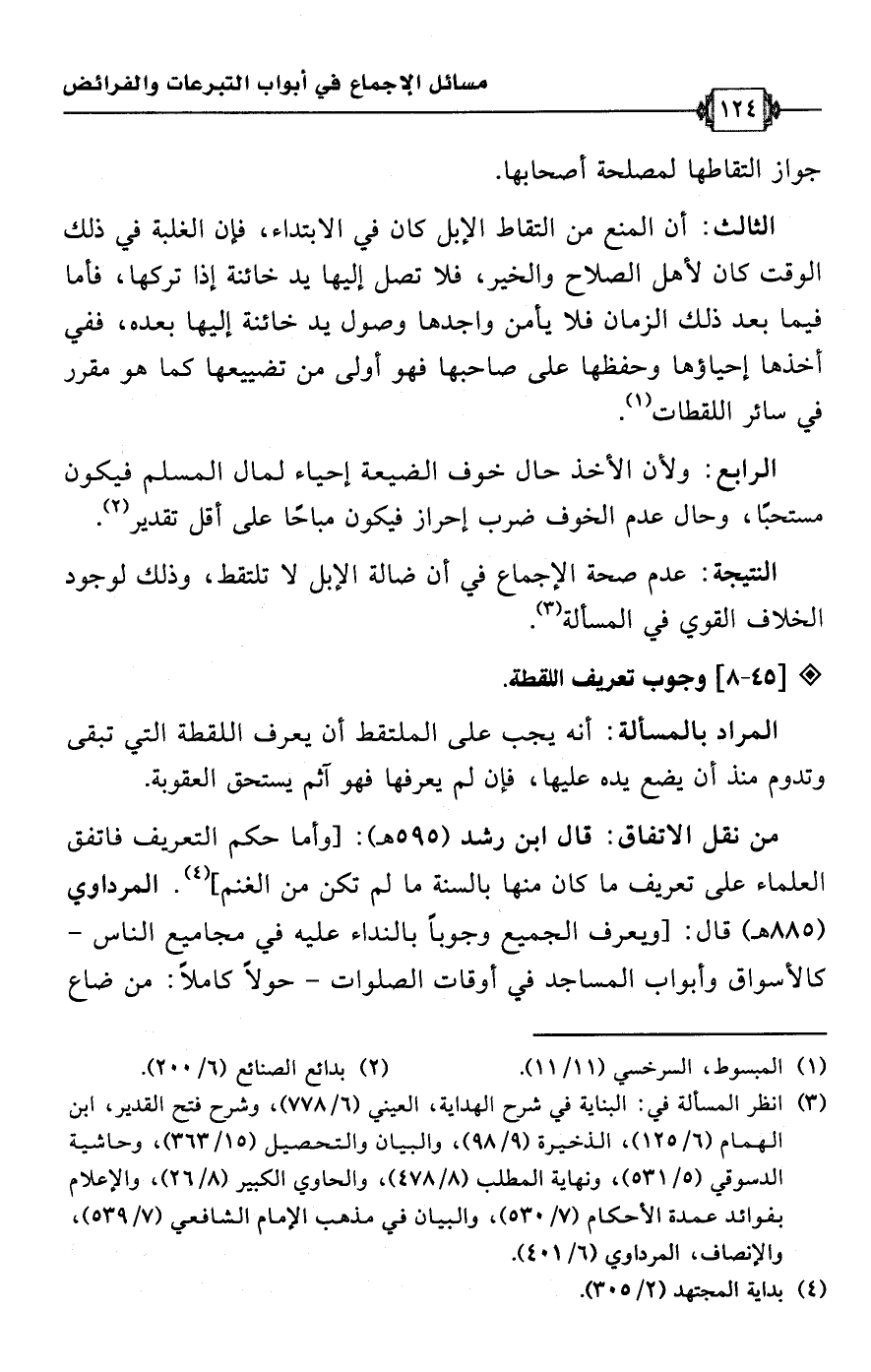 • من نقل الاتفاق: قال ابن رشد (595 هـ): [وأما حكم التعريف فاتفق العلماء على تعريف ما كان منها بالسنة ما لم تكن من الغنم] (¬4). المرداوي (885 هـ) قال: [ويعرف الجميع وجوبًا بالنداء عليه في مجاميع الناس -كالأسواق وأبواب المساجد في أوقات الصلوات- حولًا كاملًا: من ضاع