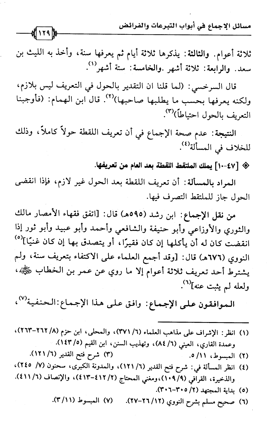 • من نقل الإجماع: ابن رشد (595 هـ) قال: [اتفق فقهاء الأمصار مالك والثوري والأوزاعي وأبو حنيفة والشافعي وأحمد وأبو عبيد وأبو ثور إذا انقضت كان له أن يأكلها إن كان فقيرًا، أو يتصدق بها إن كان غنيًا] (¬5) النووي (676 هـ) قال: [وقد أجمع العلماء على الاكتفاء بتعريف سنة، ولم يشترط أحد تعريف ثلاثة أعوام إلا ما روي عن عمر بن الخطاب -رضي اللَّه عنه-، ولعله لم يثبت عنه] (¬6).