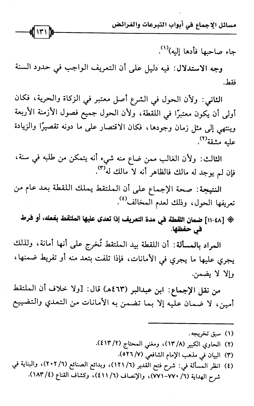 الثالث: ولأن الغالب ممن ضاع منه شيء أنه يتمكن من طلبه في سنة، فإن لم يوجد له مالك فالظاهر أنه لا مالك له (¬3).Rصحة الإجماع على أن الملتقط يملك اللقطة بعد عام من تعريفها الحول، وذلك لعدم المخالف (¬4).