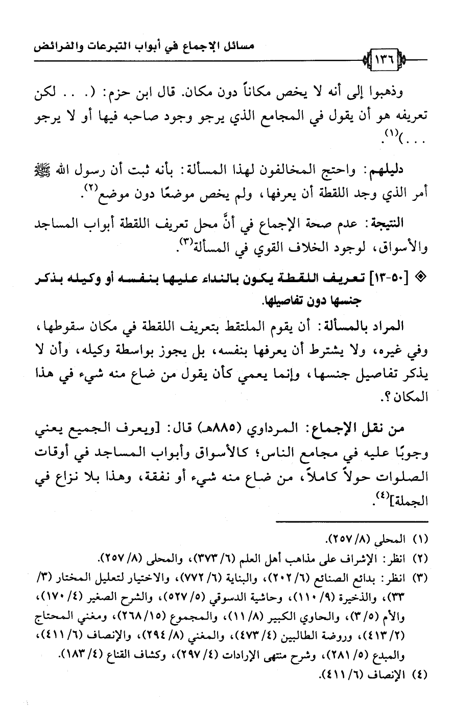 • من نقل الإجماع: المرداوي (885 هـ) قال: [ويعرف الجميع يعني وجوبًا عليه في مجامع الناس؛ كالأسواق وأبواب المساجد في أوقات الصلوات حولًا كاملًا، من ضاع منه شيء أو نفقة، وهذا بلا نزاع في الجملة] (¬4).