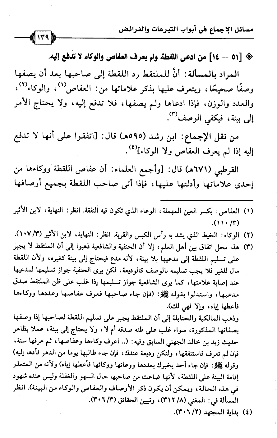 • من نقل الإجماع: ابن رشد (595 هـ) قال: [اتفقوا على أنها لا تدفع إليه إذا لم يعرف العفاص ولا الوكاء] (¬4).