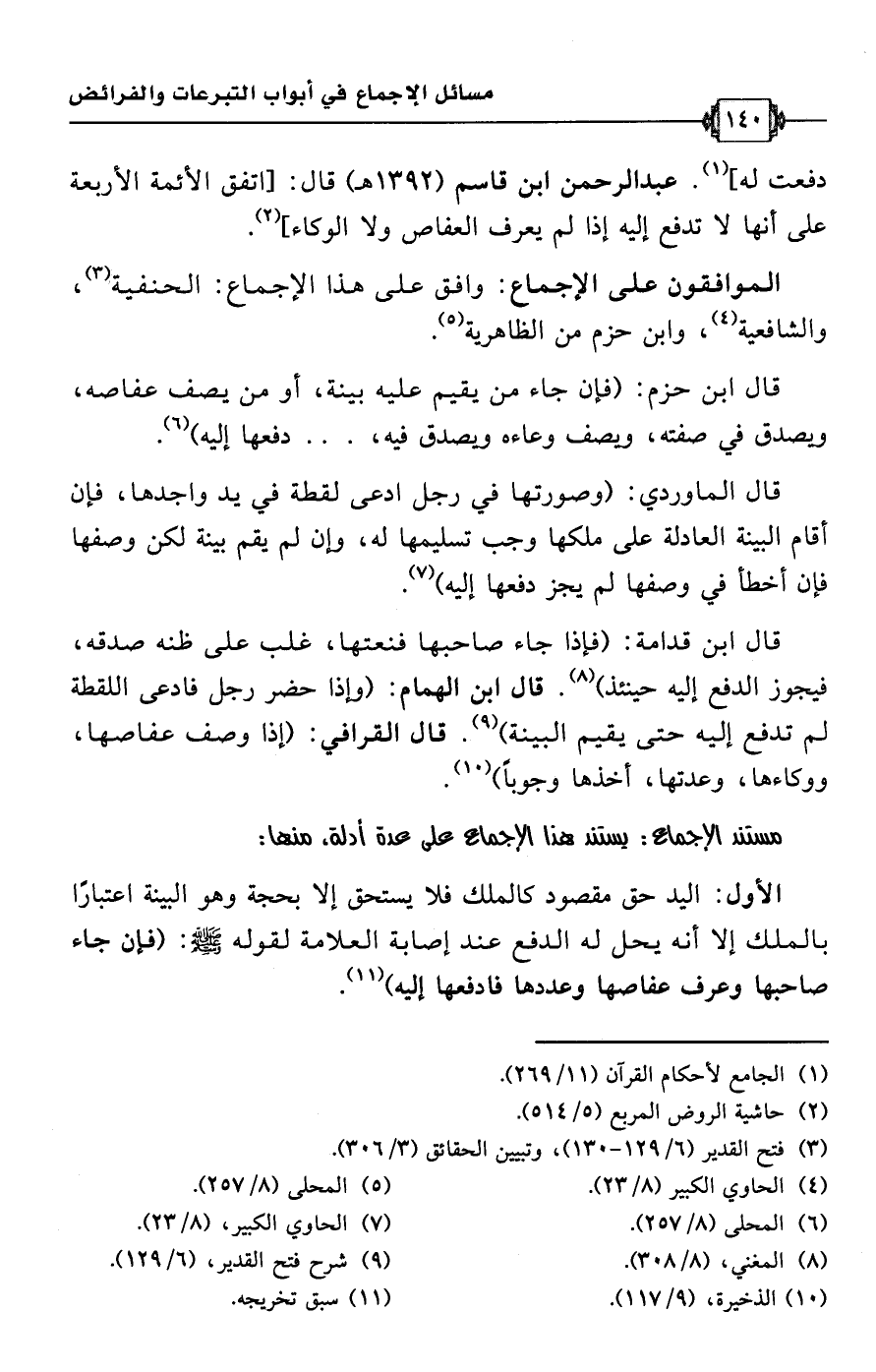 دفعت له] (¬1). عبد الرحمن ابن قاسم (1392 هـ) قال: [اتفق الأئمة الأربعة على أنها لا تدفع إليه إذا لم يعرف العفاص ولا الوكاء] (¬2).