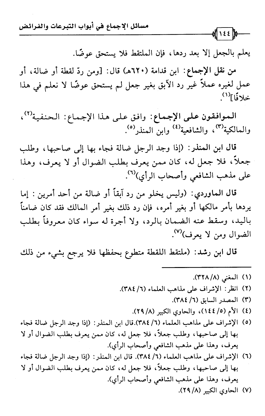 • من نقل الإجماع: ابن قدامة (620 هـ) قال: [ومن ردّ لقطة أو ضالة، أو عمل لغيره عملًا غير رد الآبق بغير جعل لم يستحق عوضًا لا نعلم في هذا خلافًا] (¬1).