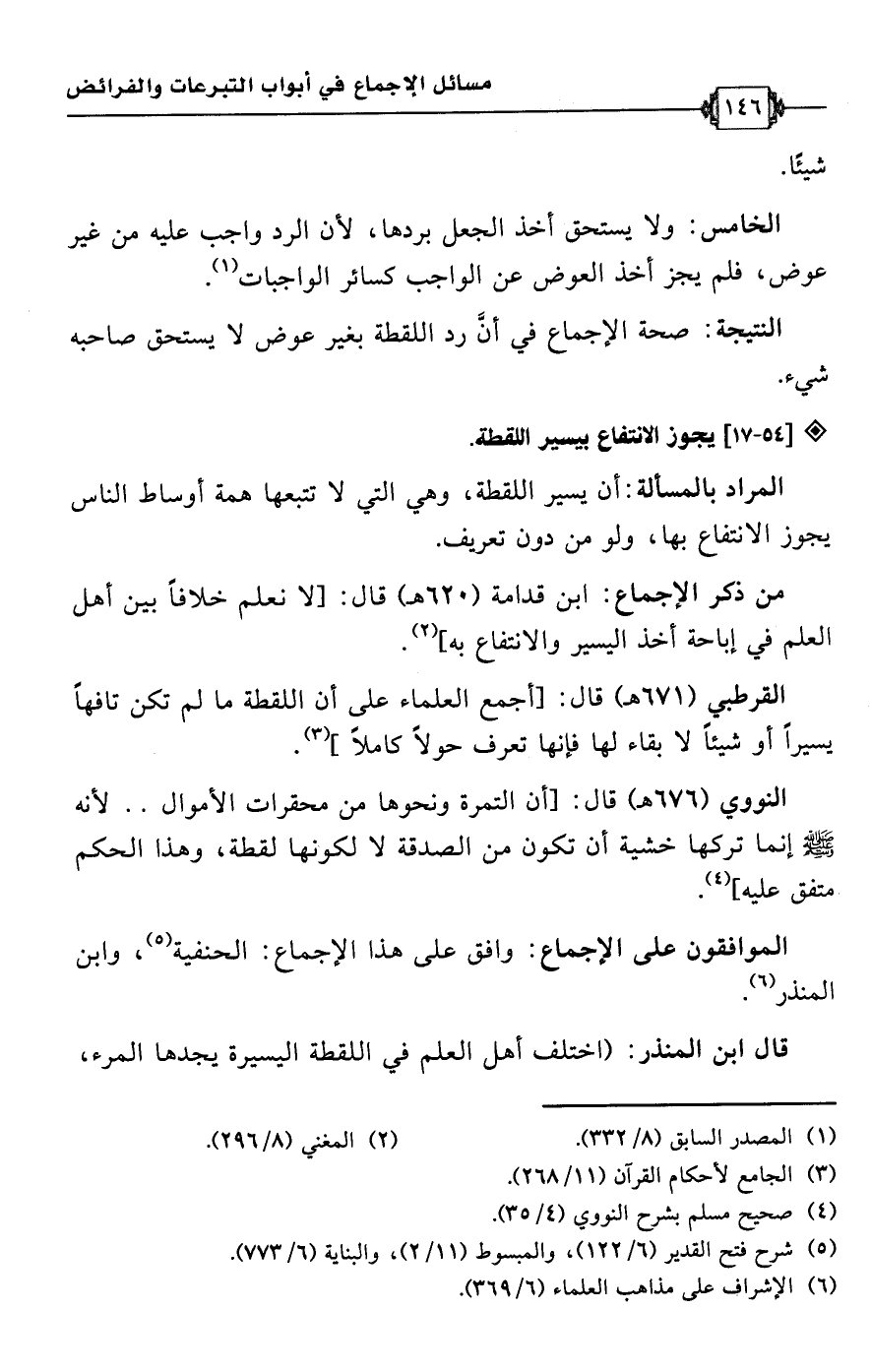 القرطبي (671 هـ) قال: [أجمع العلماء على أن اللقطة ما لم تكن تافهًا يسيرًا أو شيئًا لا بقاء لها فإنها تعرف حولًا كاملًا] (¬3).