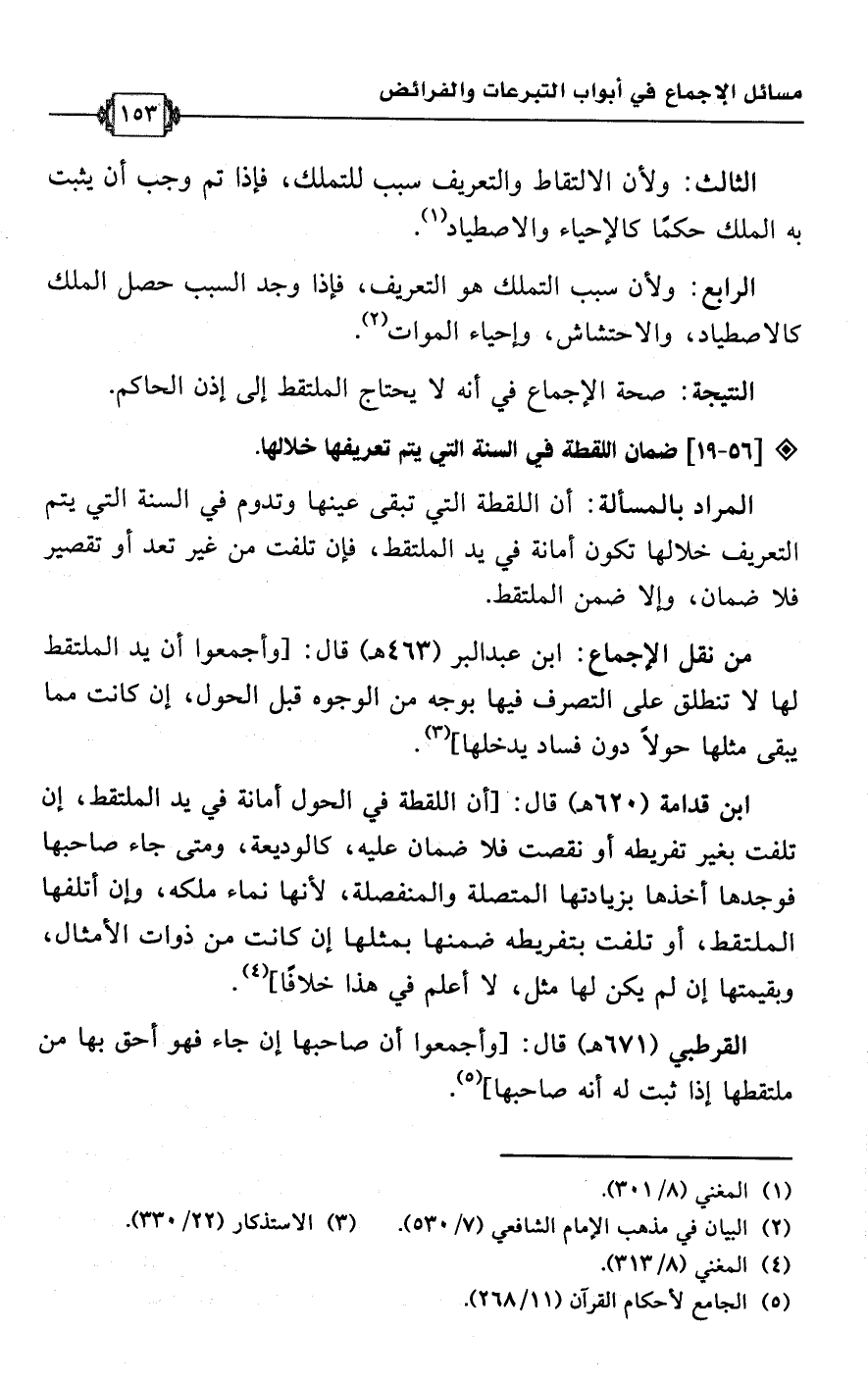 • من نقل الإجماع: ابن عبد البر (463 هـ) قال: [وأجمعوا أن يد الملتقط لها لا تنطلق على التصرف فيها بوجه من الوجوه قبل الحول، إن كانت مما يبقى مثلها حولًا دون فساد يدخلها] (¬3).