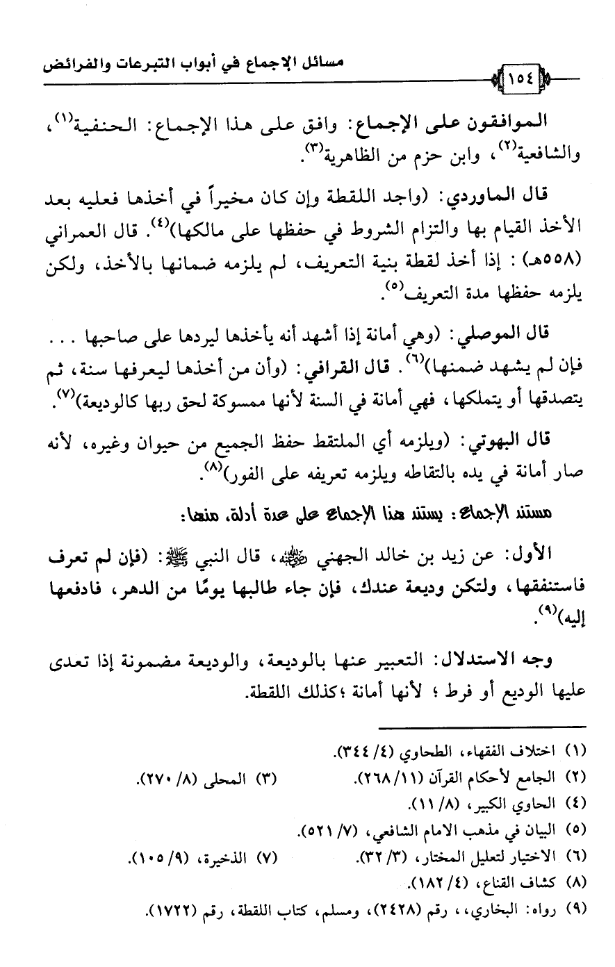 الأول: عن زيد بن خالد الجهني -رضي اللَّه عنه-، قال النبي -صلى اللَّه عليه وسلم-: (فإن لم تعرف فاستنفقها، ولتكن وديعة عندك، فإن جاء طالبها يومًا من الدهر، فادفعها إليه) (¬9).