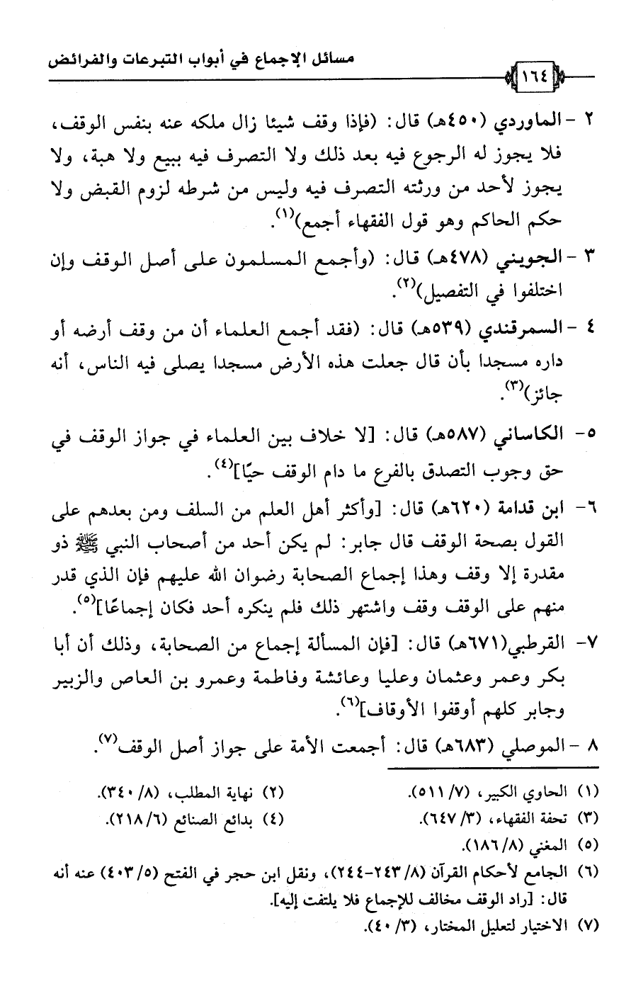 8 - الموصلي (683 هـ) قال: أجمعت الأمة على جواز أصل الوقف (¬7).