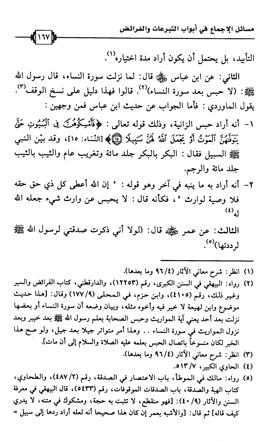 الثاني: عن ابن عباس -رضي اللَّه عنهما- قال: لما نزلت سورة النساء، قال رسول اللَّه -صلى اللَّه عليه وسلم-: (لا حبس بعد سورة النساء) (¬2). قالوا فهذا دليل على نسخ الوقف (¬3). يقول الماوردي: فأما الجواب عن حديث ابن عباس فمن وجهين: