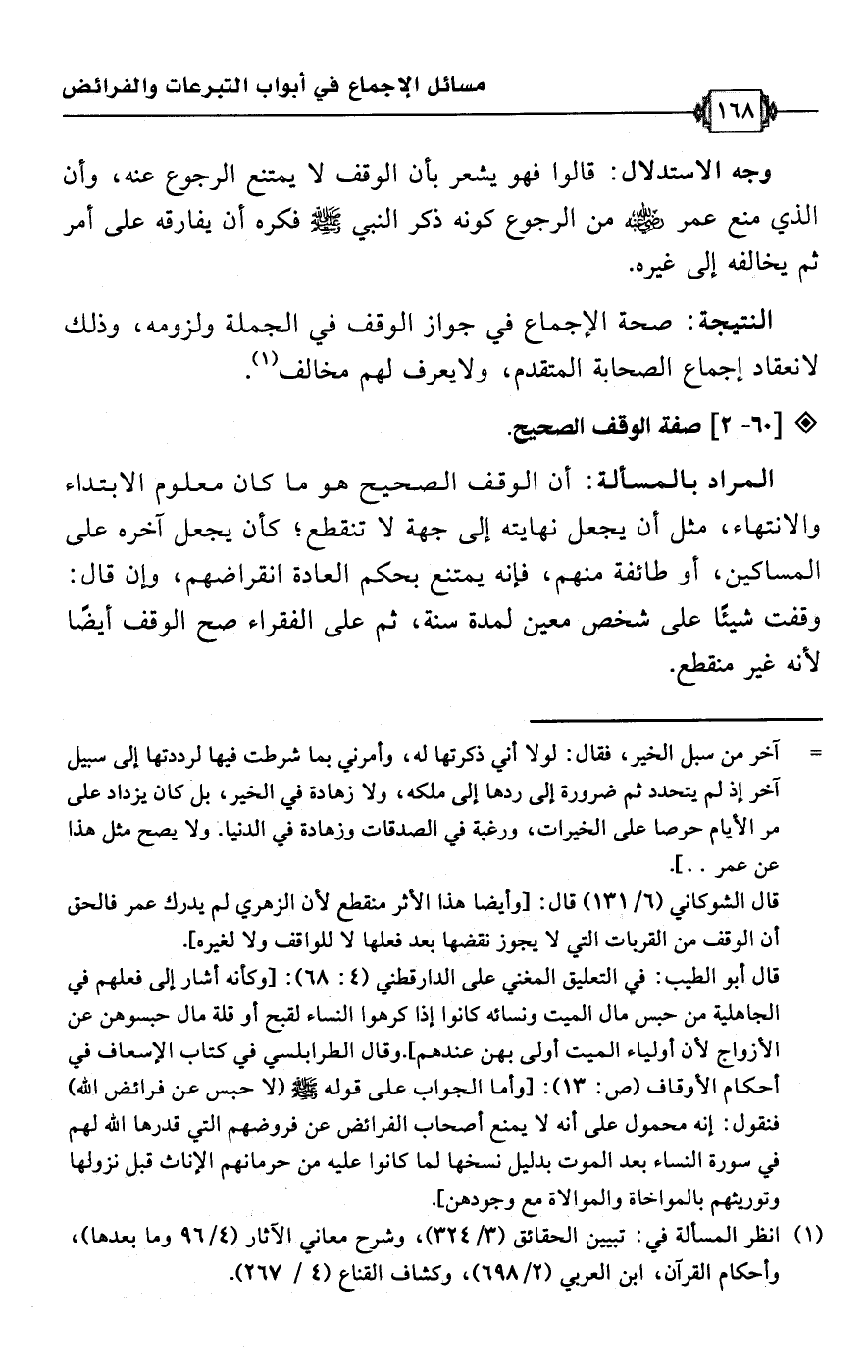 • وجه الاستدلال: قالوا فهو يشعر بأن الوقف لا يمتنع الرجوع عنه، وأن الذي منع عمر -رضي اللَّه عنه- من الرجوع كونه ذكر النبي -صلى اللَّه عليه وسلم- فكره أن يفارقه على أمر ثم يخالفه إلى غيره.Rصحة الإجماع في جواز الوقف في الجملة ولزومه، وذلك لانعقاد إجماع الصحابة المتقدم، ولا يعرف لهم مخالف (¬1).