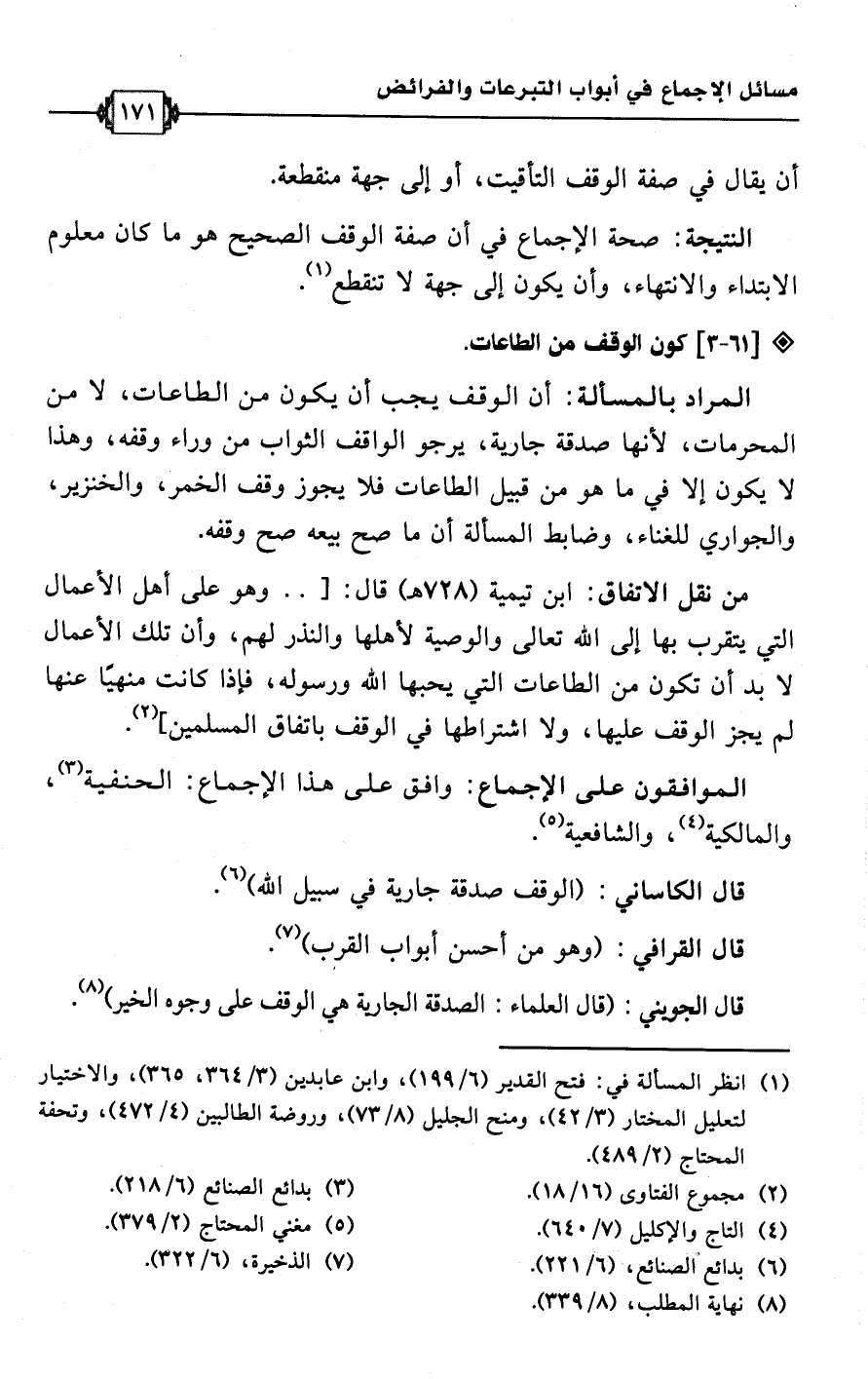 • من نقل الاتفاق: ابن تيمية (728 هـ) قال: [. . وهو على أهل الأعمال التي يتقرب بها إلى اللَّه تعالى والوصية لأهلها والنذر لهم، وأن تلك الأعمال لا بد أن تكون من الطاعات التي يحبها اللَّه ورسوله، فإذا كانت منهيًا عنها لم يجز الوقف عليها، ولا اشتراطها في الوقف باتفاق المسلمين] (¬2).