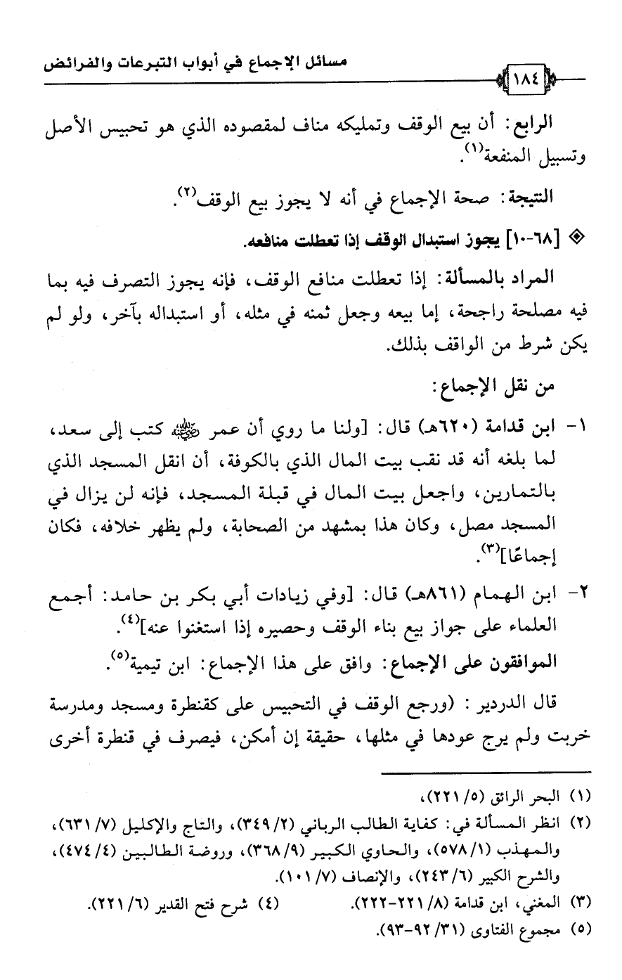 1 - ابن قدامة (620 هـ) قال: [ولنا ما روي أن عمر -رضي اللَّه عنه- كتب إلى سعد، لما بلغه أنه قد نقب بيت المال الذي بالكوفة، أن انقل المسجد الذي بالتمارين، واجعل بيت المال في قبلة المسجد، فإنه لن يزال في المسجد مصل، وكان هذا بمشهد من الصحابة، ولم يظهر خلافه، فكان إجماعًا] (¬3).