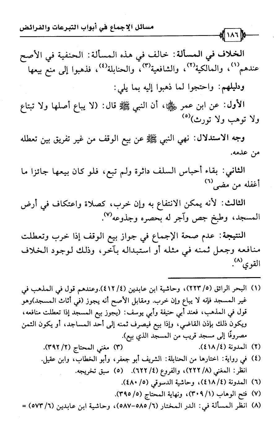 الثالث: لأنه يمكن الانتفاع به وإن خرب، كصلاة واعتكاف في أرض المسجد، وطبخ جص وآجر له بحصره وجذوعه (¬7).Rعدم صحة الإجماع في جواز بيع الوقف إذا خرب وتعطلت منافعه وجعل ثمنه في مثله أو استبداله بآخر، وذلك لوجود الخلاف القوي (¬8).