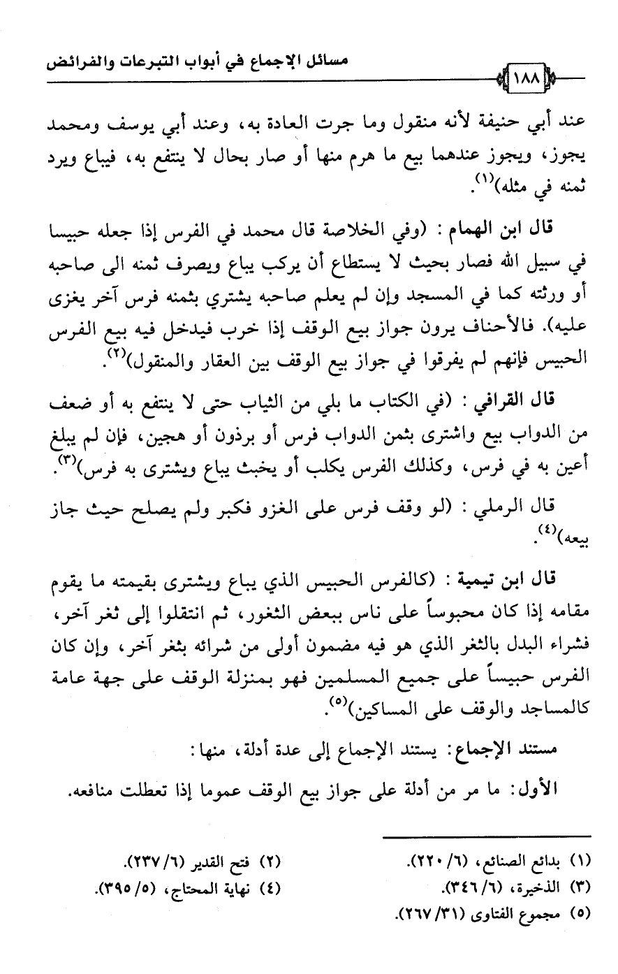 قال ابن الهمام: (وفي الخلاصة قال محمد في الفرس إذا جعله حبيسا في سبيل اللَّه فصار بحيث لا يستطاع أن يركب يباع ويصرف ثمنه إلى صاحبه أو ورثته كما في المسجد وإن لم يعلم صاحبه يشتري بثمنه فرس آخر يغزى عليه). فالأحناف يرون جواز بيع الوقف إذا خرب فيدخل فيه بيع الفرس الحبيس فإنهم لم يفرقوا في جواز بيع الوقف بين العقار والمنقول) (¬2).