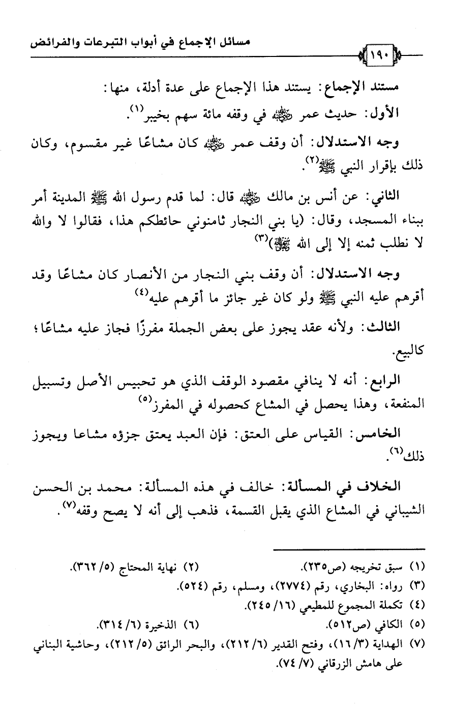 • الخلاف في المسألة: خالف في هذه المسألة: محمد بن الحسن الشيباني في المشاع الذي يقبل القسمة، فذهب إلى أنه لا يصح وقفه (¬7).