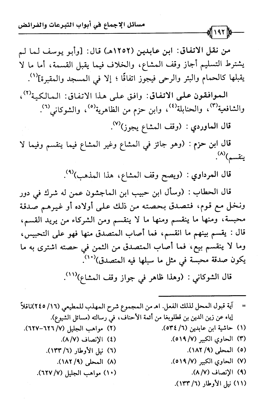 • من نقل الاتفاق: ابن عابدين (1252 هـ) قال: [وأبو يوسف لما لم يشترط التسليم أجاز وقف المشاع، والخلاف فيما يقبل القسمة، أما ما لا يقبلها كالحمام والبئر والوحى فيجوز اتفاقًا؛ إلا في المسجد والمقبرة] (¬1).