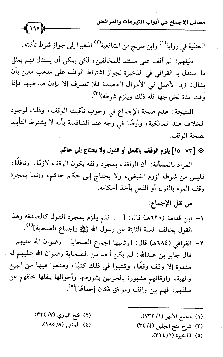 2 - القرافي (684 هـ) قال: [وثانيها اجماع الصحابة -رضوان اللَّه عليهم- قال جابر بن عبد اللَّه: لم يكن أحد من الصحابة رضوان اللَّه عليهم له مقدرة إلا وقف وقفًا، وكتبوا في ذلك كتبًا، ومنعوا فيها من البيع والهبة، وأوقافهم مشهورة بالحرمين بشروطها وأحوالها ينقلها خلفهم عن سلفهم، فهم بين واقف وموافق فكان إجماعًا] (¬5).