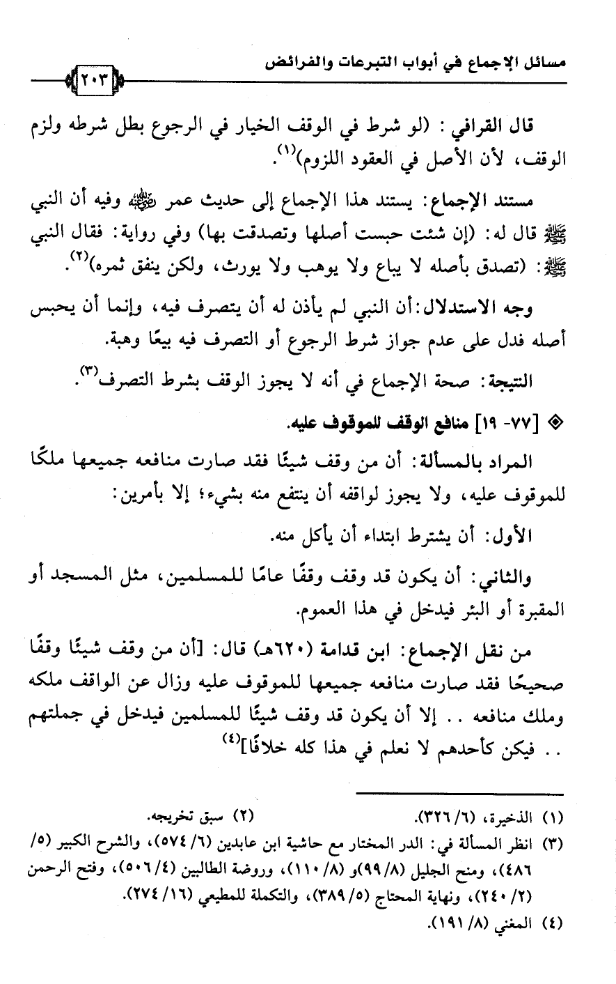 • من نقل الإجماع: ابن قدامة (620 هـ) قال: [أن من وقف شيئًا وقفًا صحيحًا فقد صارت منافعه جميعها للموقوف عليه وزال عن الواقف ملكه وملك منافعه. . إلا أن يكون قد وقف شيئًا للمسلمين فيدخل في جملتهم. . فيكن كأحدهم لا نعلم في هذا كله خلافًا] (¬4)