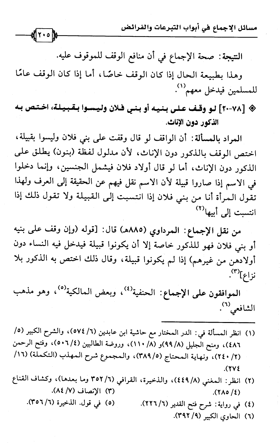 • من نقل الإجماع: المرداوي (885 هـ) قال: [قوله (وإن وقف على بنيه أو بني فلان فهو للذكور خاصة إلا أن يكونوا قبيلة فيدخل فيه النساء دون أولادهن من غيرهم) إذا لم يكونوا قبيلة، وقال ذلك اختص به الذكور بلا نزاع] (¬3).