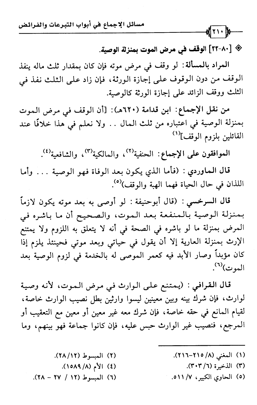 • من نقل الإجماع: ابن قدامة (620 هـ): [أن الوقف في مرض الموت بمنزلة الوصية في اعتباره من ثلث المال. . ولا نعلم في هذا خلافًا عند القائلين بلزوم الوقف] (¬1)