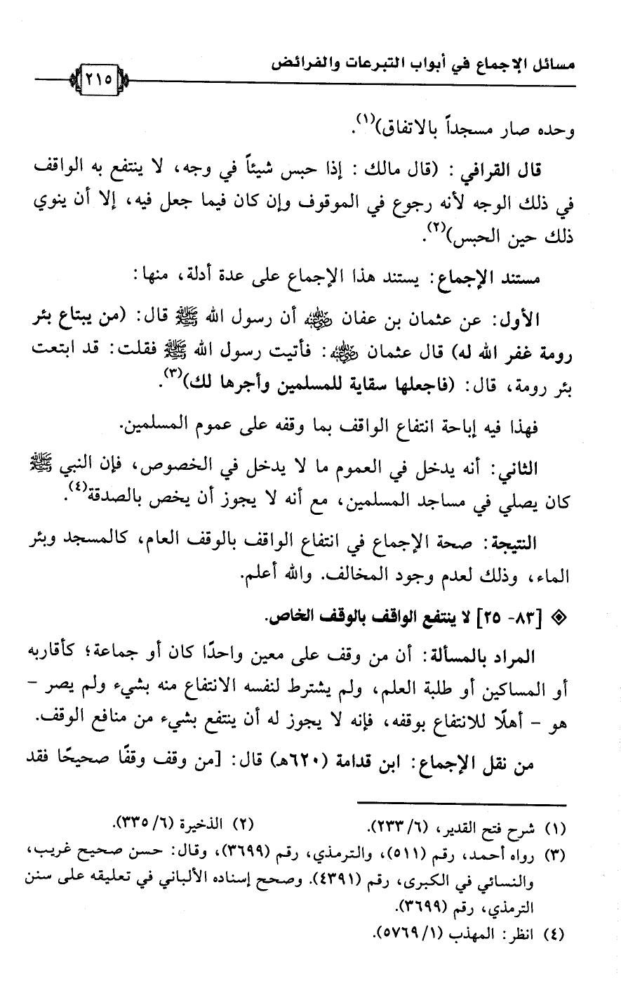 الثاني: أنه يدخل في العموم ما لا يدخل في الخصوص، فإن النبي -صلى اللَّه عليه وسلم- كان يصلي في مساجد المسلمين، مع أنه لا يجوز أن يخص بالصدقة (¬4).Rصحة الإجماع في انتفاع الواقف بالوقف العام، كالمسجد وبئر الماء، وذلك لعدم وجود المخالف. واللَّه أعلم.