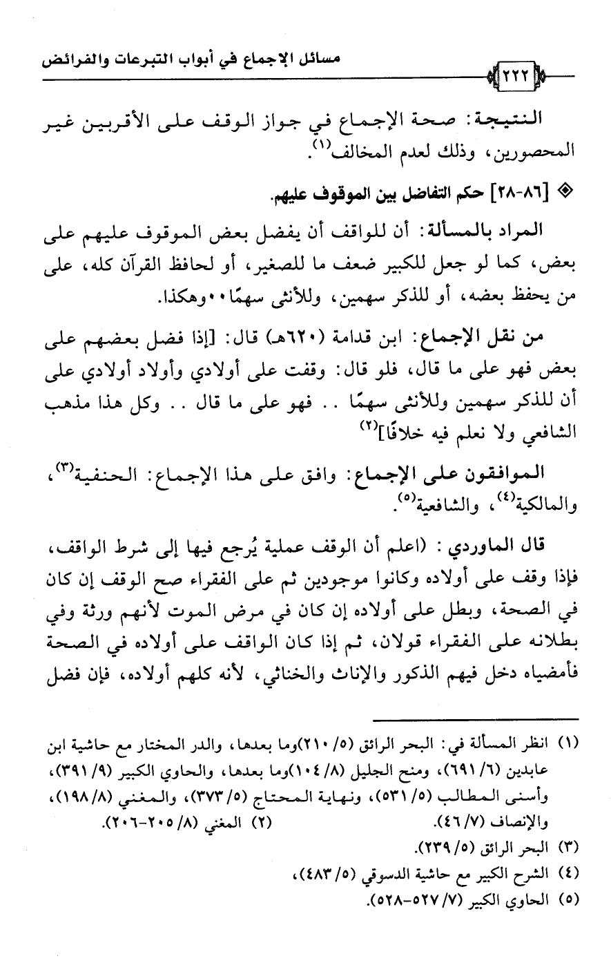 • من نقل الإجماع: ابن قدامة (620 هـ) قال: [إذا فضل بعضهم على بعض فهو على ما قال، فلو قال: وقفت على أولادي وأولاد أولادي على أن للذكر سهمين وللأنثى سهمًا. . فهو على ما قال. . وكل هذا مذهب الشافعي ولا نعلم فيه خلافًا] (¬2)