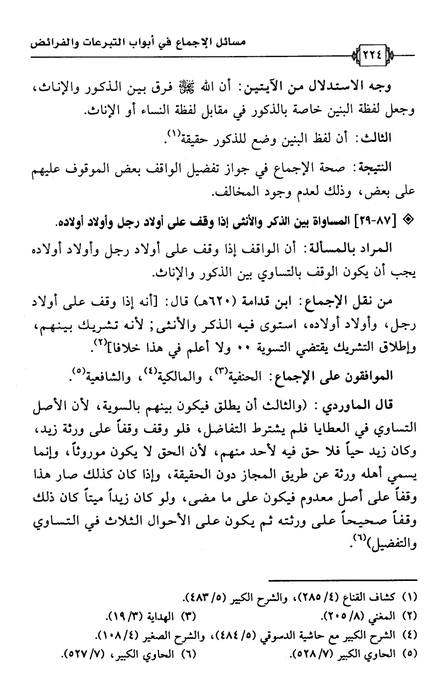 • من نقل الإجماع: ابن قدامة (620 هـ) قال: [أنه إذا وقف على أولاد رجل، وأولاد أولاده، استوى فيه الذكر والأنثى؛ لأنه تشريك بينهم، وإطلاق التشريك يقتضي التسوية. . ولا أعلم في هذا خلافا] (¬2).