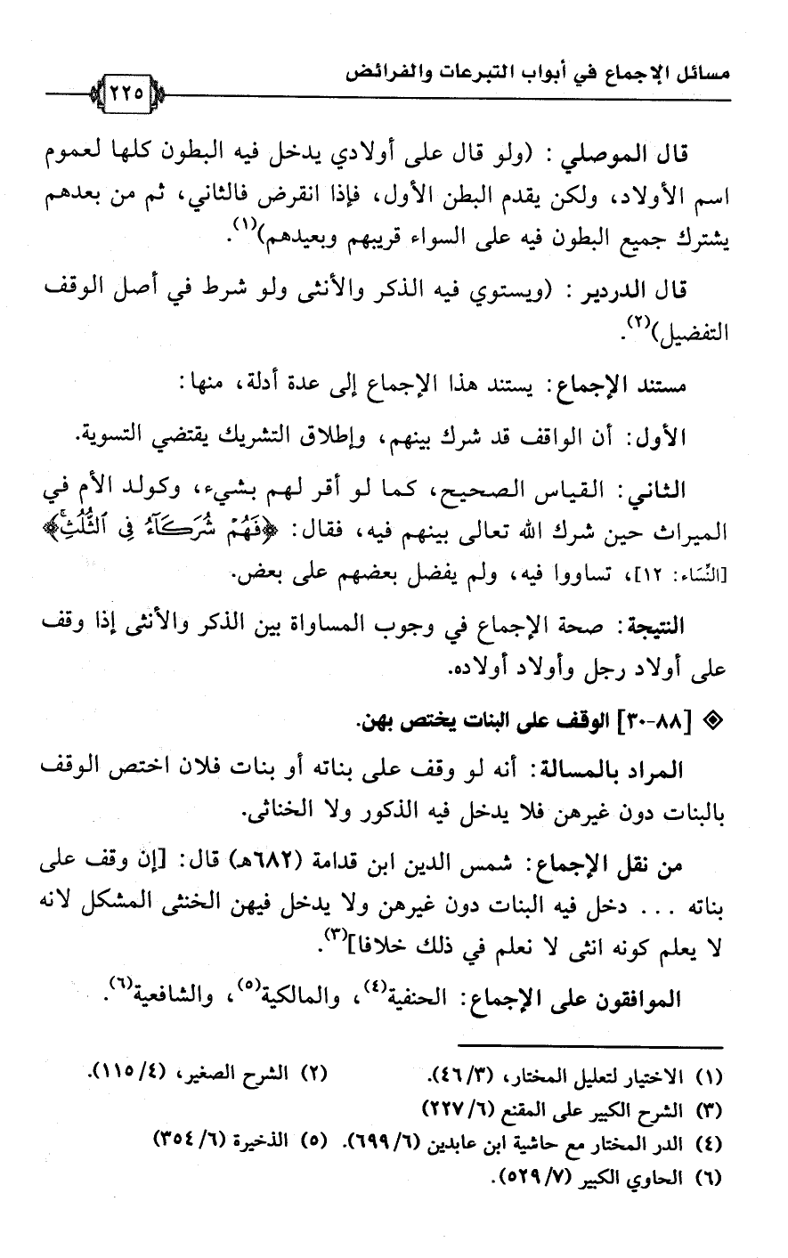 • من نقل الإجماع: شمس الدين ابن قدامة (682 هـ) قال: [إن وقف على بناته. . . دخل فيه البنات دون غيرهن ولا يدخل فيهن الخنثى المشكل لأنه لا يعلم كونه أنثى لا نعلم في ذلك خلافا] (¬3).