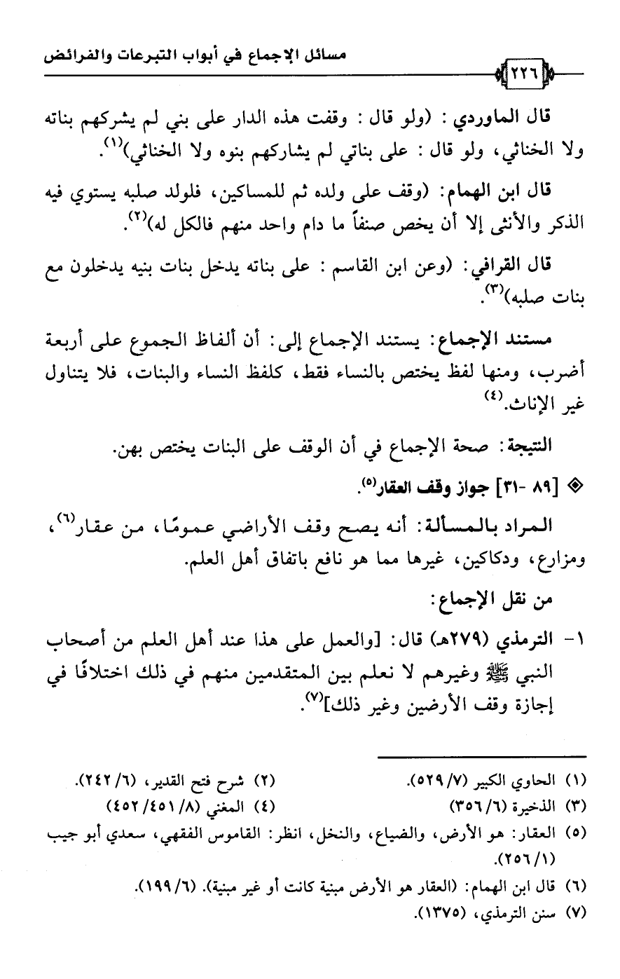 • مستند الإجماع: يستند الإجماع إلى: أن ألفاظ الجموع على أربعة أضرب، ومنها لفظ يختص بالنساء فقط، كلفظ النساء والبنات، فلا يتناول غير الإناث. (¬4) Rصحة الإجماع في أن الوقف على البنات يختص بهن.