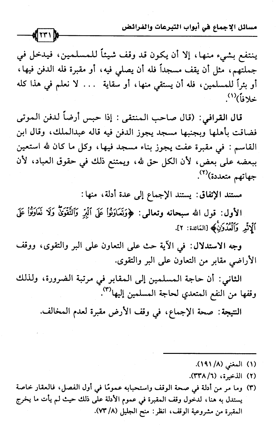 الثاني: أن حاجة المسلمين إلى المقابر في مرتبة الضرورة، ولذلك وقفها من النفع المتعدي لحاجة المسلمين إليها (¬3).Rصحة الإجماع، في وقف الأرض مقبرة لعدم المخالف.