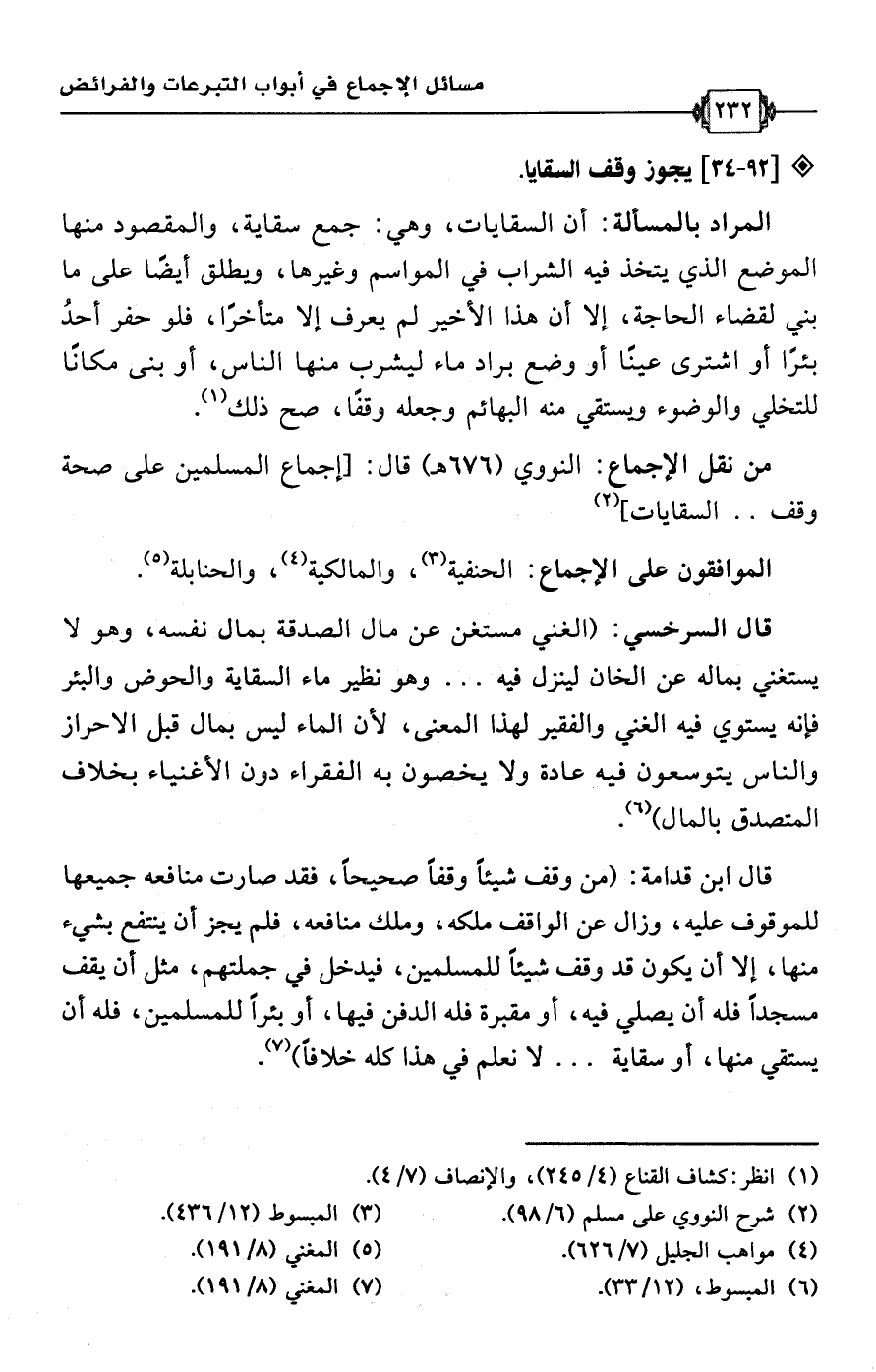 • من نقل الإجماع: النووي (676 هـ) قال: [إجماع المسلمين على صحة وقف. . السقايات] (¬2)
