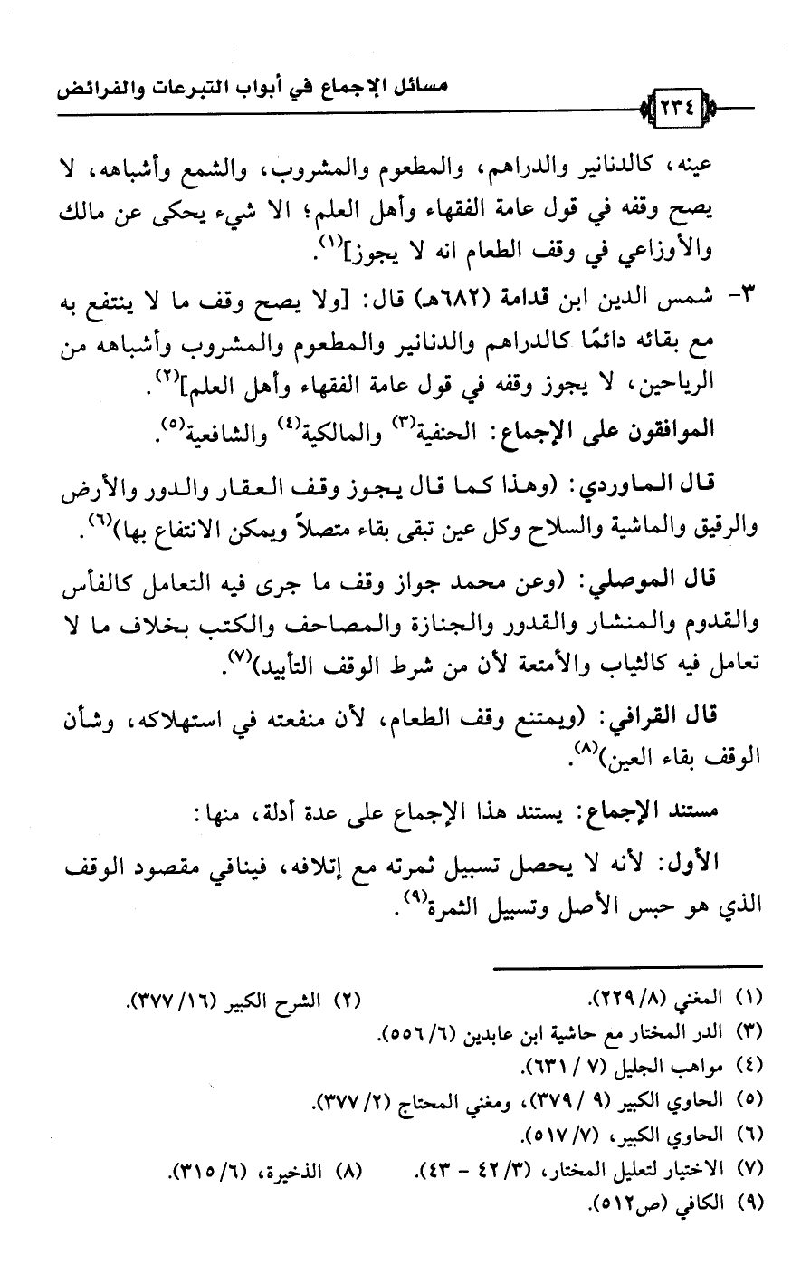3 - شمس الدين ابن قدامة (682 هـ) قال: [ولا يصح وقف ما لا ينتفع به مع بقائه دائمًا كالدراهم والدنانير والمطعوم والمشروب وأشباهه من الرياحين، لا يجوز وقفه في قول عامة الفقهاء وأهل العلم] (¬2).